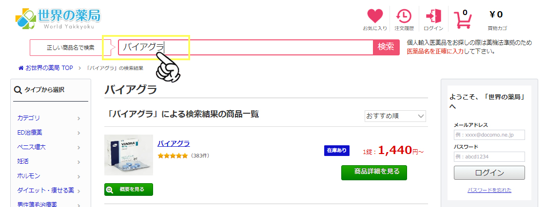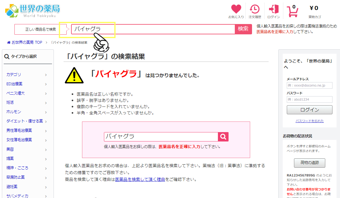 世界の薬局では、薬機法に沿って商品名を正しく入力しなければ商品が表示されない仕様になっております。