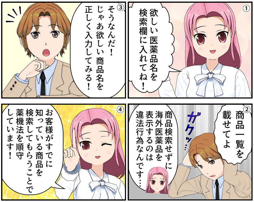 しかし、お客様がすでに知っている医薬品を検索し表示することは医薬品の広告・宣伝にはあたりません。そのために一度検索して頂くというわけです。