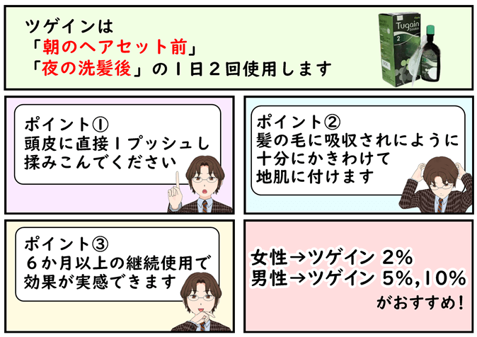 ミノキシジル2%配合のツゲインは、他のAGA治療薬では使用することができない、女性の薄毛で知られる、女性男性型脱毛症(FAGA)への効果が確認されています。 男性だけではなく、女性も使用できるのが、他の薄毛治療薬にはないため、ツゲイン2%に限った特徴です。 女性でも薄毛で悩まれている方は多いため、とても女性には嬉しいで商品ですね! ※女性は2%以上の含有量は使用できませんのでお気をつけください。