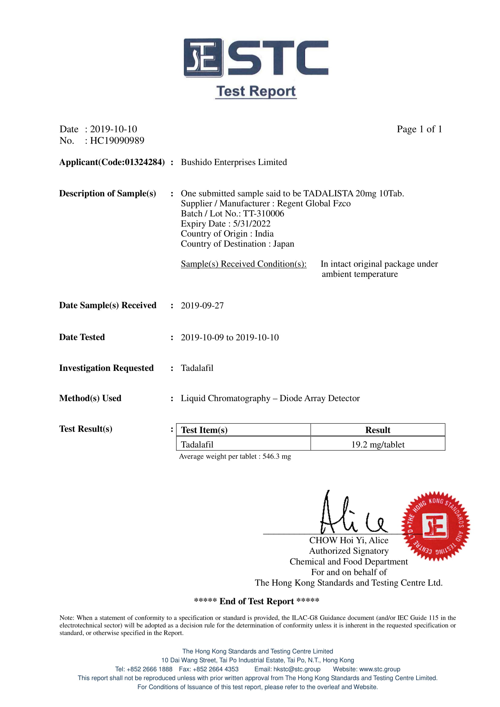 世界の薬局が提供するタダリスタ(シアリスジェネリック)20mgはTesting Centre Ltdにより以下の通り成分鑑定がされております。
