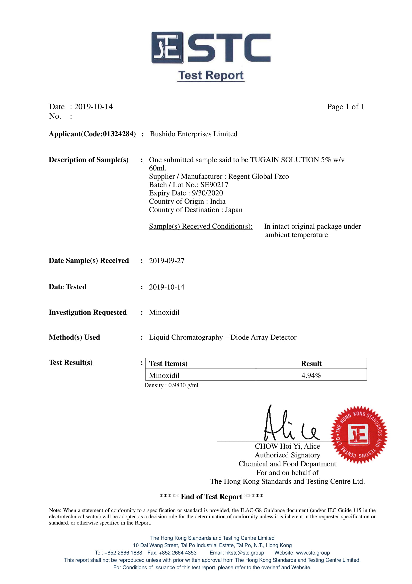 ベストケンコーが提供するツゲイン5(ミノキシジル5%)はThe Hong Kong Standards and Testing Centre Ltdにより以下の通り成分鑑定がされております。
